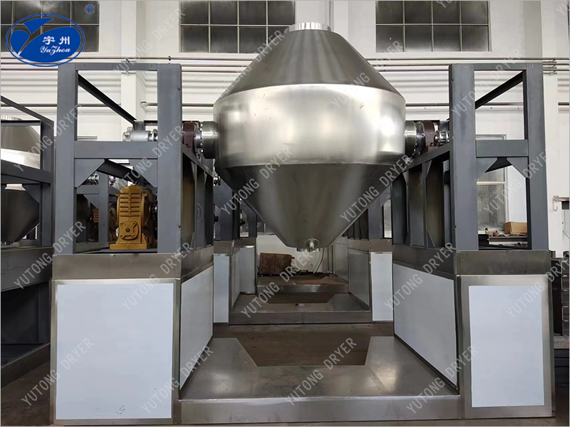 SZG series double-cone rotary vacuum dryer is a double-cone rotary tank body. The tank body is heated by heat conduction oil or hot water into the jacket under vacuum condition, and the heat is in contact with the wet material through the inner wall of the tank. The vapor or other gases that evaporate after absorbing heat from the wet material are pumped away through the vacuum pump through the vacuum exhaust pipe. Because the tank is in a vacuum state, and the rotation of the tank makes the material constantly up and down, inside and outside, it speeds up the drying speed of the material, improves the drying rate, and achieves the purpose of uniform drying.