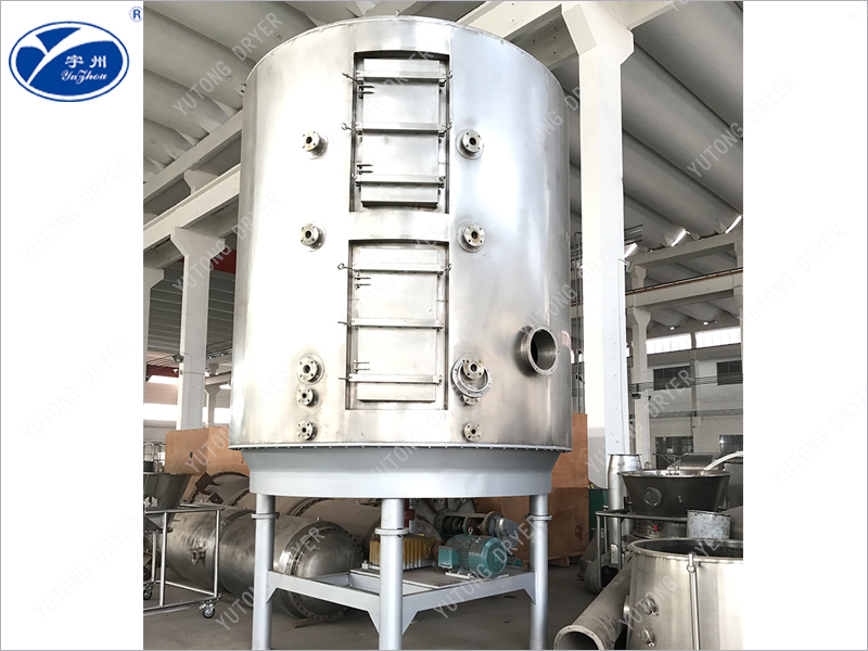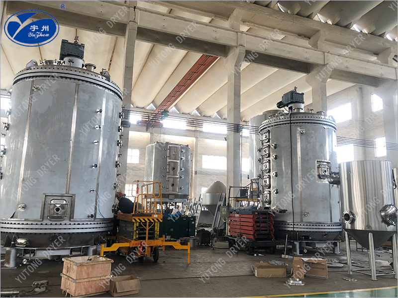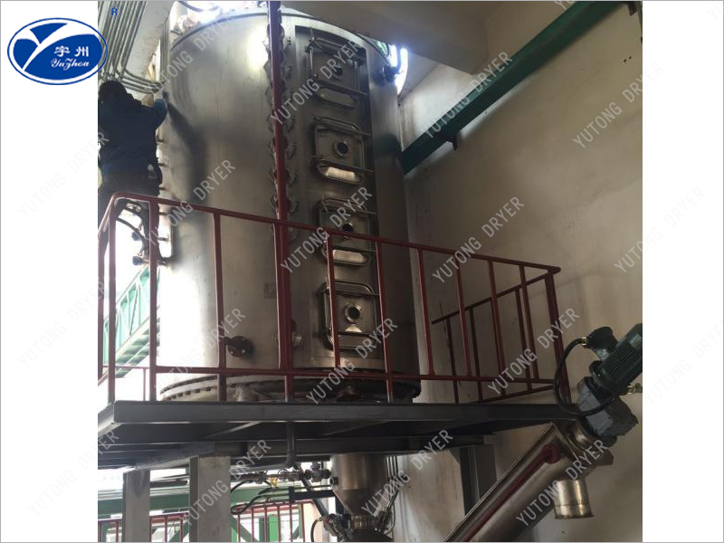 The wet material containing solvent is continuously added to the main machine feeding hopper through the spiral feeder, and the material is continuously added to the drying disc on the upper layer of the dryer under the action of the stirring motor. The rake arm with the rake blade does rotating motion to make the rake blade continuously turn over the material, so that the material fully absorbs heat. The material flows through the surface of the drying disc along the exponential helix, and the material on the small drying disc is transferred to the outer edge. And the outer edge of the large drying tray falls below the outer edge, the material on the large drying tray moves inward and falls into the lower small drying tray from the middle blanking port, the size of the drying tray is alternately arranged up and down, the material can continuously flow through the whole dryer, and the heating medium heat conduction oil is passed into the hollow drying tray. The heating medium enters the drying pan surface from one end of the drying pan and is exported from the other end. The dried material falls to the cooling bottom of the shell from the drying disc of the latter layer, and is finally transferred by the rake blade to the discharge port and discharged into the bottom discharge spiral, and discharged out of the machine through the buffer tank. The wet solvent evaporates from the material and escapes after vaporization, and is drawn out after settlement by the buffer tank at the top. The solvent is condensed into the buffer tank by the condenser for recovery, and the wet air is emptied.