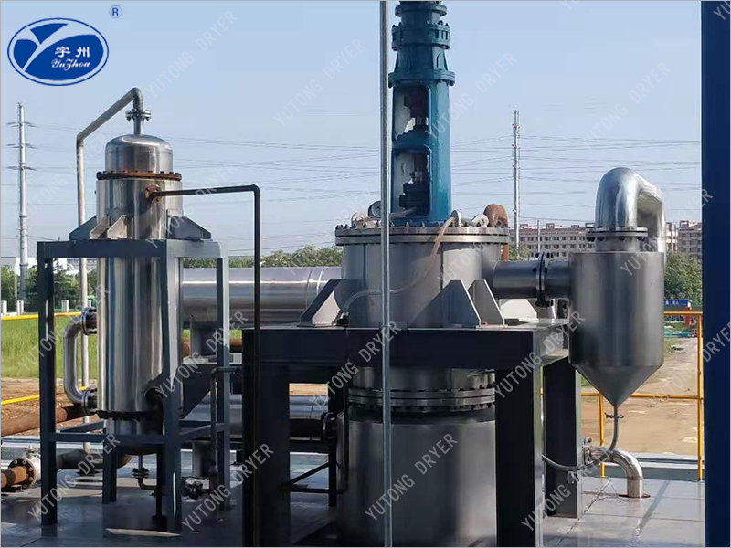 The material enters the evaporator radially from above the heating zone, and is distributed to the heating wall of the evaporator through the distributor. Then, the rotating scraper continuously and uniformly scrapes the material into a thin and uniform liquid film on the heating surface, and pushes it downwards in a spiral shape. During this process, the rotating scraper ensures continuous and uniform liquid film to generate high-speed turbulence, and prevents the liquid film from coking and scaling on the heating surface, thereby improving the total transfer coefficient. Light components are evaporated to form a steam stream that rises and passes through a vapor-liquid separator to reach an external condenser directly connected to the evaporator. Heavy components are discharged from the cone at the bottom of the evaporator.
