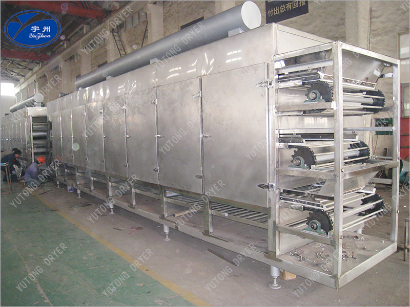 2、the series of belt dryer to be processed materials using multi-layer mobile stainless steel mesh belt or vibration plate, hot air flow through the mesh belt and the material layer on the bottom up, heat exchange uniform, sufficient, high production efficiency, good product quality, with a cold layer and rotary feeding device, low discharge temperature, conducive to timely packaging.