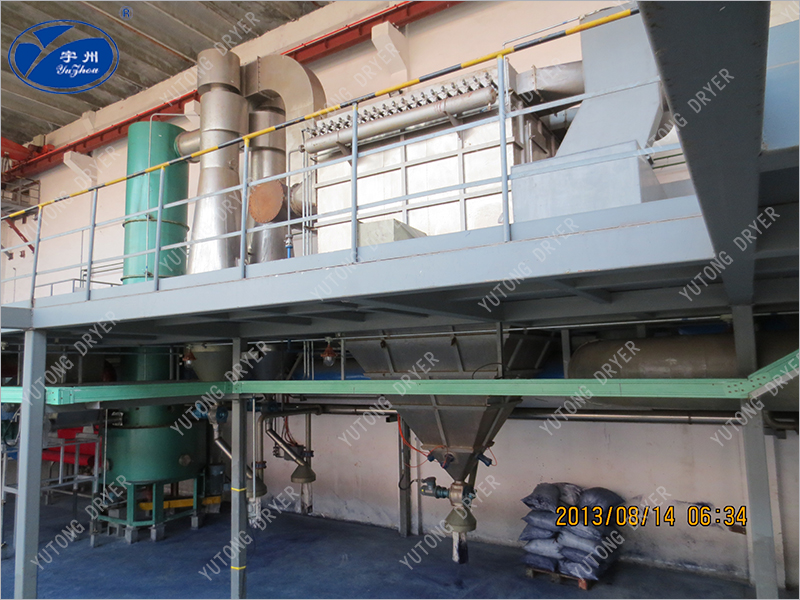 經過初、中效過濾的環境空氣由干燥系統引風機吸入熱風空氣,與蒸汽換熱后產生的熱風進入閃蒸干燥主機,與經過螺旋加料器送入干燥主機的待干燥濾餅,在干燥主機內完成傳熱傳質的干燥過程,氣固混合物由旋風分離器和布袋除塵器分離,物料被從干燥系統氣體內分離出來,排出干燥系統,尾氣由引風機排入大氣。