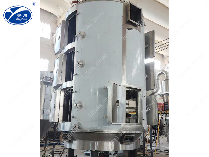 濕物料自加料器連續地加到干燥設備的D1層盤上,帶有耙葉的耙臂做回轉運動,使耙葉連續地翻轉物料,物料沿著指數螺旋線流過干燥盤表面,在低干燥盤上的物料移到外緣,并在外緣降落到下方的高干燥盤外緣,在高干燥盤上的物料向里移動并從中間落料落入下一層低干燥盤中,高低干燥盤上下交替排列,物料得以連續地流過整個干燥設備,中空的干燥盤內通入加熱介質,加熱介質從一端進入另一端導出,已干燥物料從Z后一層干燥盤降落到殼體底層,最后被耙葉移動到料口流出。蒸發出來的蒸汽經設置在頂部的排濕口流出,溶劑經冷凝器收回后經真空泵流出室外。底部流出的干物料冷卻后直接包裝。