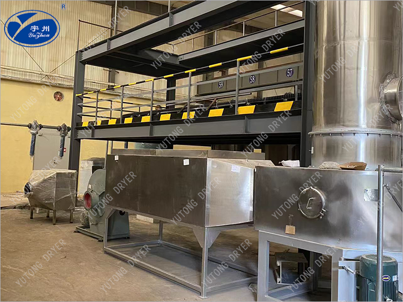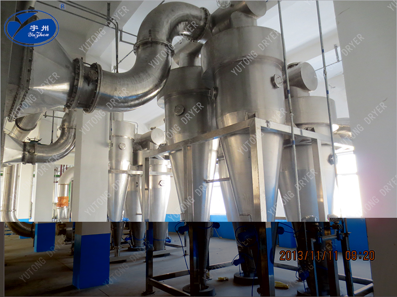 經過初、中效過濾的環境空氣由干燥系統鼓風機鼓入蒸汽散熱器加熱至工藝設定溫度,進入閃蒸干燥主機,與經過螺旋加料器送入干燥主機的待干燥濾餅,在干燥主機唄完成傳熱介質的干燥過程,氣固混合物由布袋除塵器分離、過濾后,物料被從干燥系統氣體內分離出來,排出干燥系統,尾氣由引風機排入大氣。