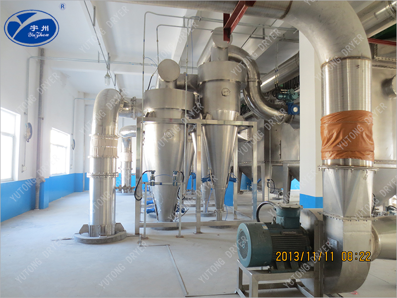 干燥采用自然風(fēng),自然風(fēng)經(jīng)過空氣過濾器后,由風(fēng)機(jī)鼓入空氣加熱設(shè)備內(nèi)被加熱,加熱后的熱風(fēng)再經(jīng)閃蒸主機(jī)熱風(fēng)分配器,分配成均勻、一定流速、流向的旋風(fēng)。旋風(fēng)與螺旋加料器加入的濕物料接觸、碰撞,開始質(zhì)熱交換、分離等一系列的物理變化,使得物料與所含濕份分離,終達(dá)干燥。