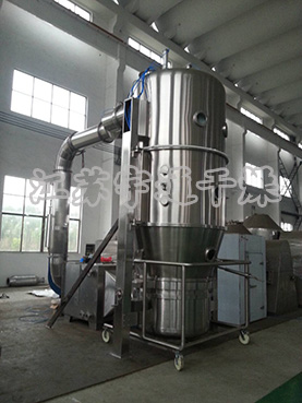 FL型沸騰制粒干燥機(jī):物料粉末粒子,在原料容器(流化床)中呈環(huán)形流化狀態(tài)。受到經(jīng)過凈化后的加熱空氣預(yù)熱和混合,將粘合劑溶液霧化噴入,使若干粒子聚集成含有粘合劑的團(tuán)粒,由于熱空氣對(duì)物料的不斷干燥,使團(tuán)粒中的水分蒸發(fā),粘合劑凝固,此過程不斷重復(fù)進(jìn)行,形成理想的、均勻的多微孔球狀顆粒。