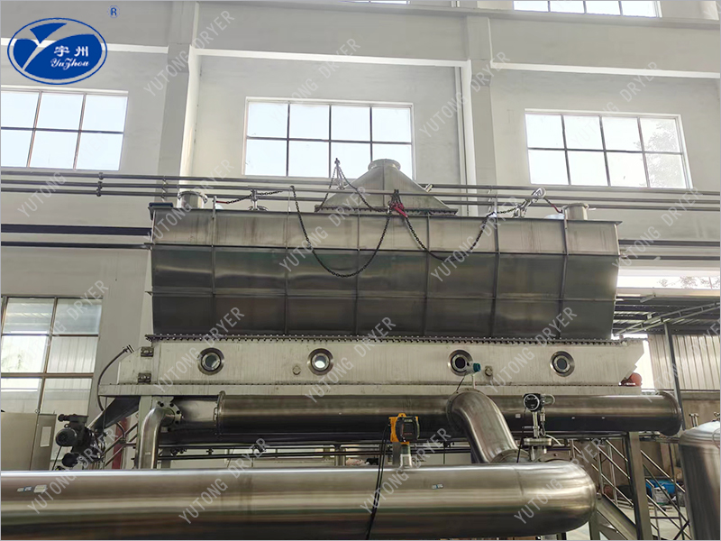 4、閉路循環沸騰干燥機帶有翻板機構,實現了在全密閉條件下進行出料,大大降低了工人的勞動強度與操作車間內完全無粉塵,車間環境好,自動化成度高。