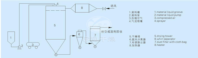 После нагрева чистым воздухом он попадает в сухую башню и превращается в крошечные капли с использованием двойных (или трехжидкостных) сопел в горячем воздухе внутри башни. Он осуществляет быстрый теплообмен с горячим воздухом, испаряет воду (или растворитель) в жидком материале и сливается с горячим воздухом, получая порошкообразный продукт.