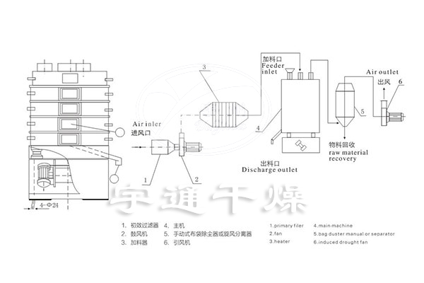 1、Горячий воздух многократно проходит через слой материала и течет в обратном направлении с материалом, обеспечивая полный теплообмен и высокую тепловую эффективность。